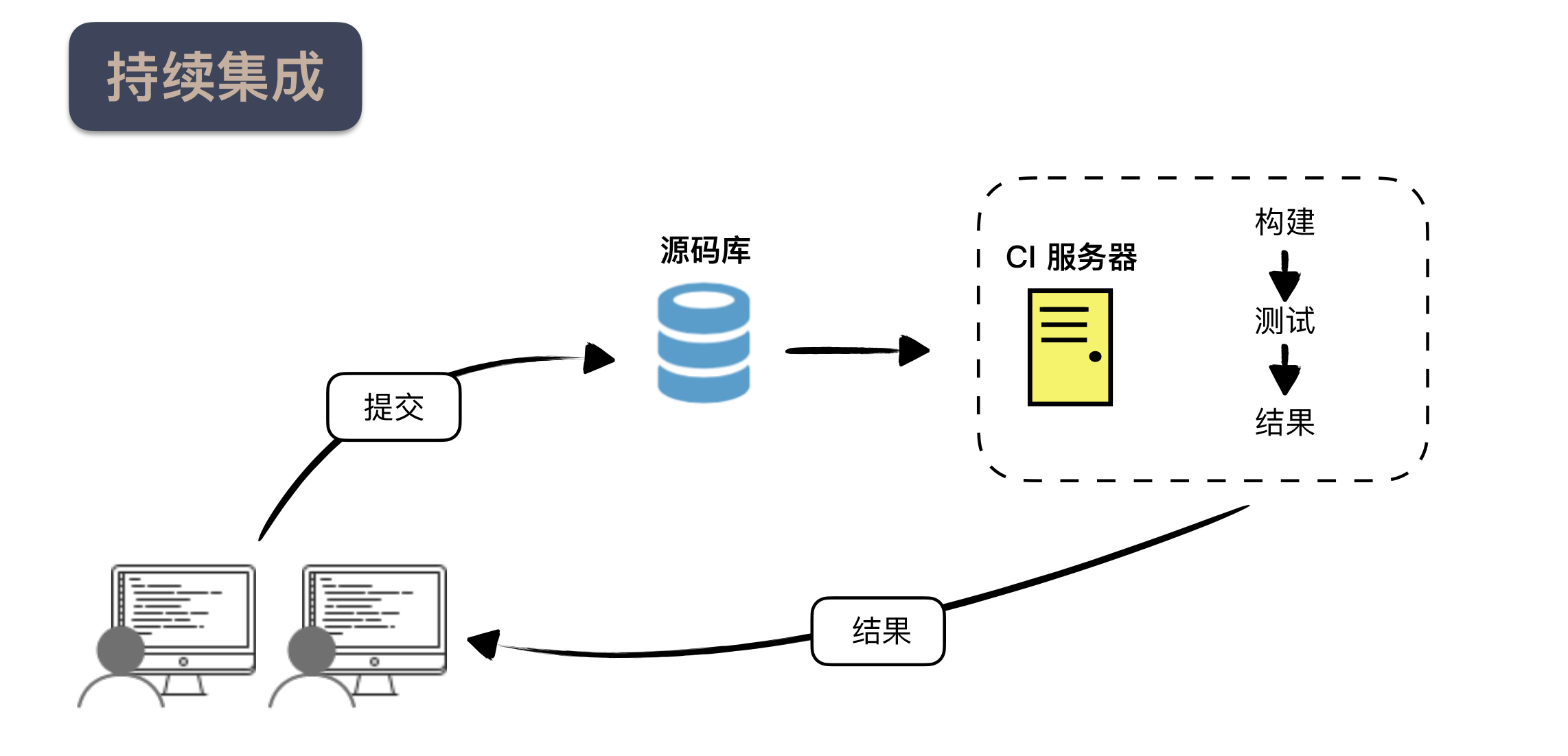 - 每日构建作为早期的一种“最佳实践”被提了出来,当人们进一步“调小”参数后,诞生了一个更极致的实践:持续集成,也就是每次提交代码都进行集成